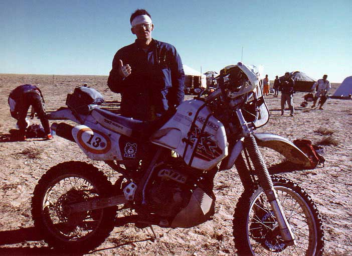 8日目、スタート前。6日目に怪我した包帯が痛々しい。包帯のせいで走行中は見づらかった。手のひらのマメが取れ、テーピングをするが、ハンドルを握るのが苦痛だった。