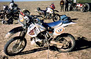 広い広いセンダル・オボー大平原を行く。160km行った所に分岐があったので、タイヤの跡に従って走行する。ところがICOとコマ図を見ると位置がおかしい。頼りのGPS(自分の位置を知るための機器・緯度、経度で表示される)は電池が切れて作動しない。大平原の真中で3回往復(70km)するが分からなくなり、ガソリンも足りなくなってきた。とりあえずさっきのポイントに戻ろうと走ったら運よく、主催者の最後の車に出会いほっとした。わかるポイントまで連れて行ってもらった。